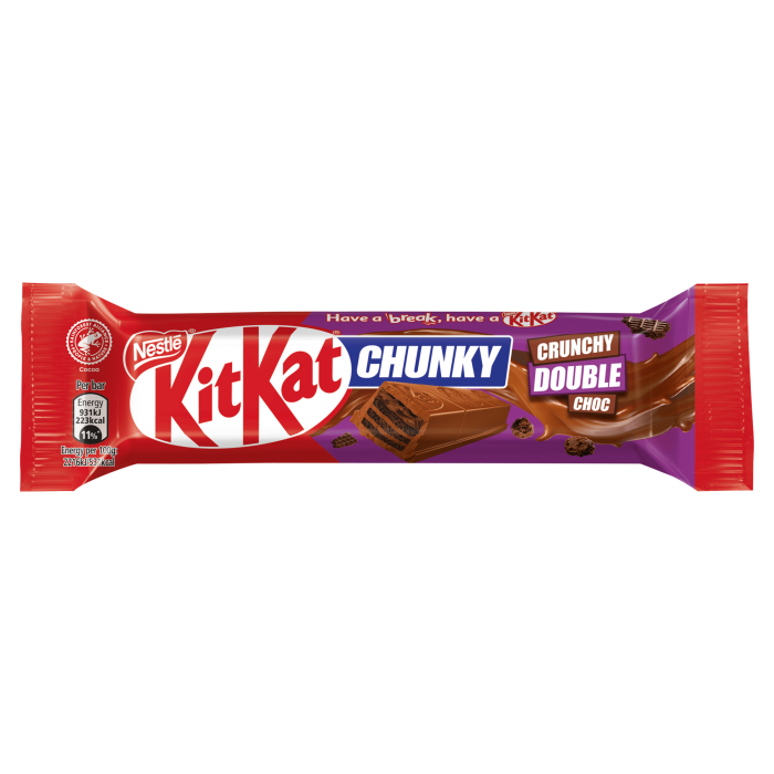 🍭 Packen Sie es aus, brechen Sie ein Stück ab und genießen Sie die köstliche, weiche Milchschokolade und die knusprige Waffel mit Schokoladenfüllung von KITKAT Chunky Crunchy Double Chocolate.