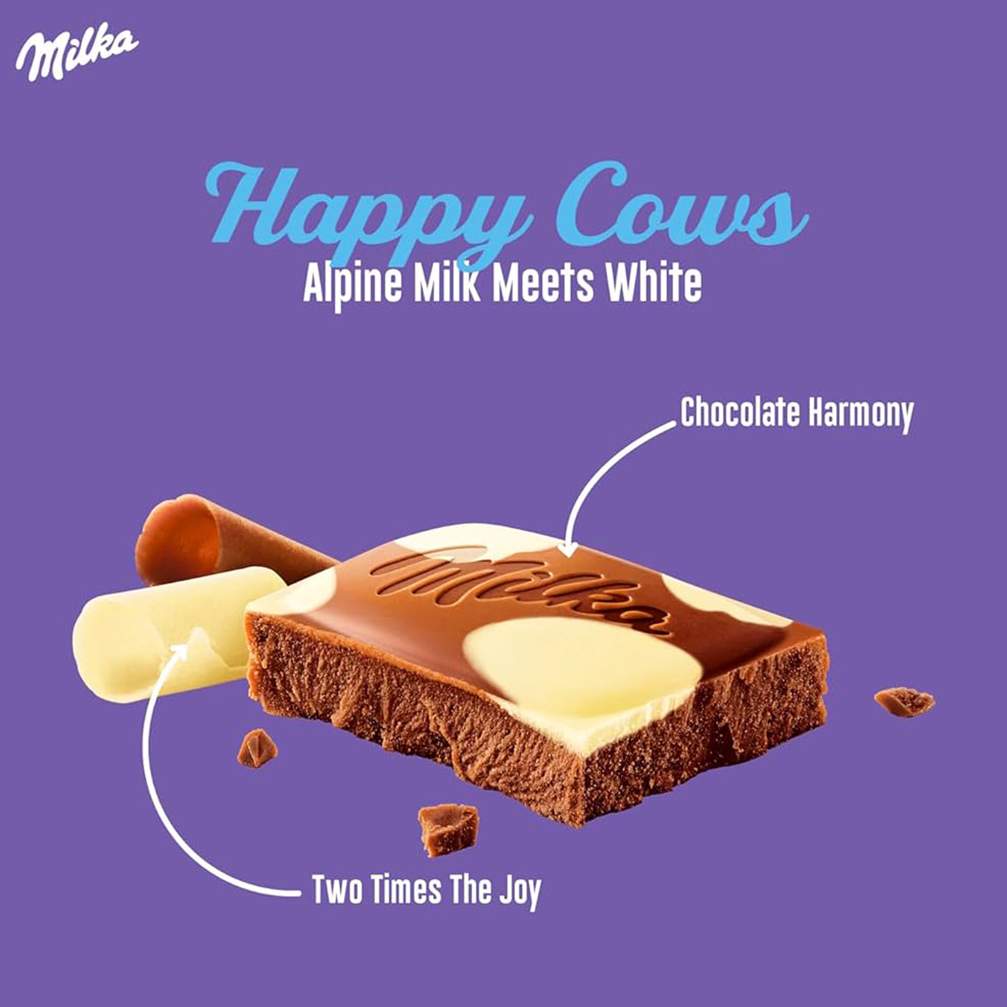 🍭Milka Happy Cows ist eine einzigartige und gescheckte Tafel von Schockolade, die feinste Schokolade wurde mit süßen Flicken aud weißer Schokolade bedeckt.