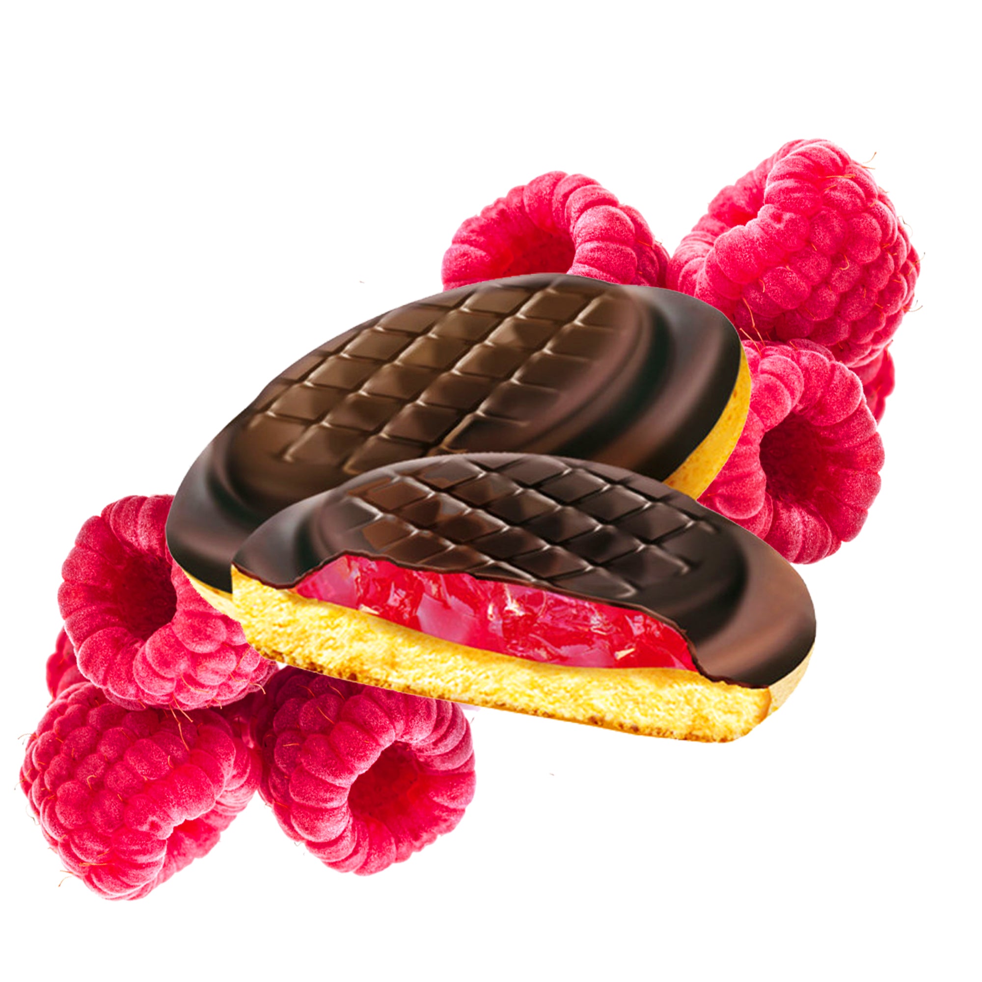 Zucker, Fruktose-Glukose-Sirup, WEIZENmehl, Eier, Kakaobutter, Magermilchpulver, Maisstärke, Kakaomasse. Feuchthaltemittel (Glycerin), Molkenpulver (MILCH), Rapsöl, MILCHfett, Säureregulatoren (Zitronensäure, Apfelsäure, Natriumcitrate), Geliermittel (Pektin), konzentrierter Himbeersaft 0,3 %, Aromen, Farbstoffe (Karmin, Carotine) , Emulgatoren (Sojalecithin, E476, E471), Salz, Backtriebmittel (Ammoniumcarbonate), Haselnusspaste.