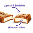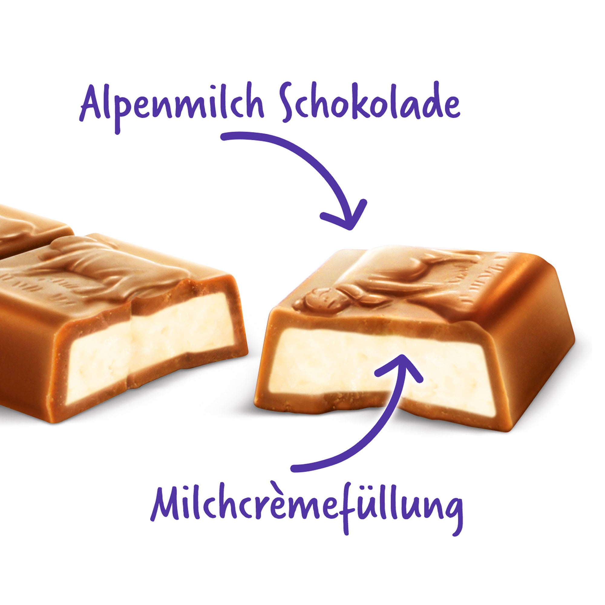 🍭 8 einzeln verpackte Riegel aus Alpenmilch-Schokolade mit Milch-Crème-Füllung.