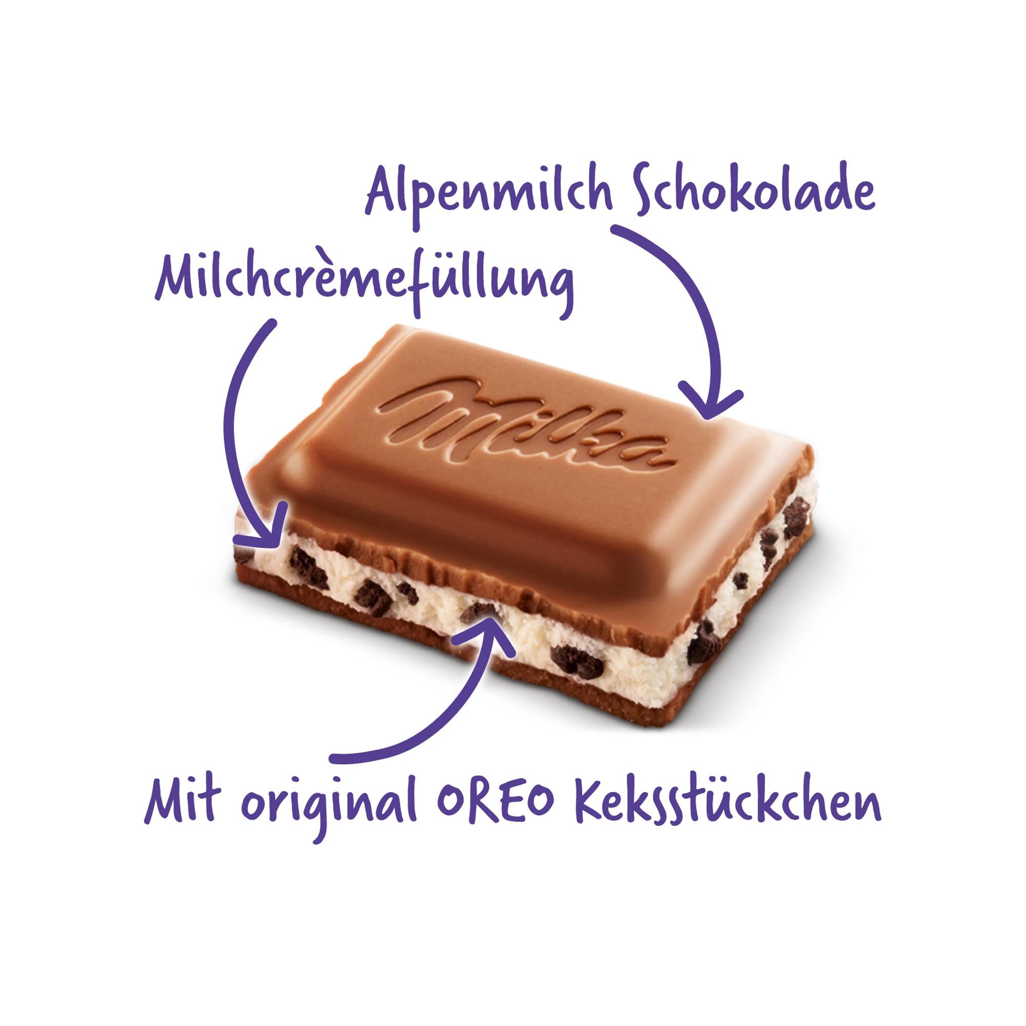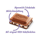 🍭 Alpenmilch-Schokolade mit Kakaokeks-Stückchen und Alpenmilch-Creme-Füllung mit Vanille-Geschmack.