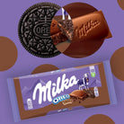 Schokolade mit Kakaokeksstückchen (12%) und einer Milchcrèmefüllung (40%) mit schokoladegeschmack.