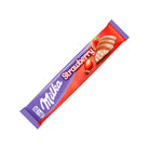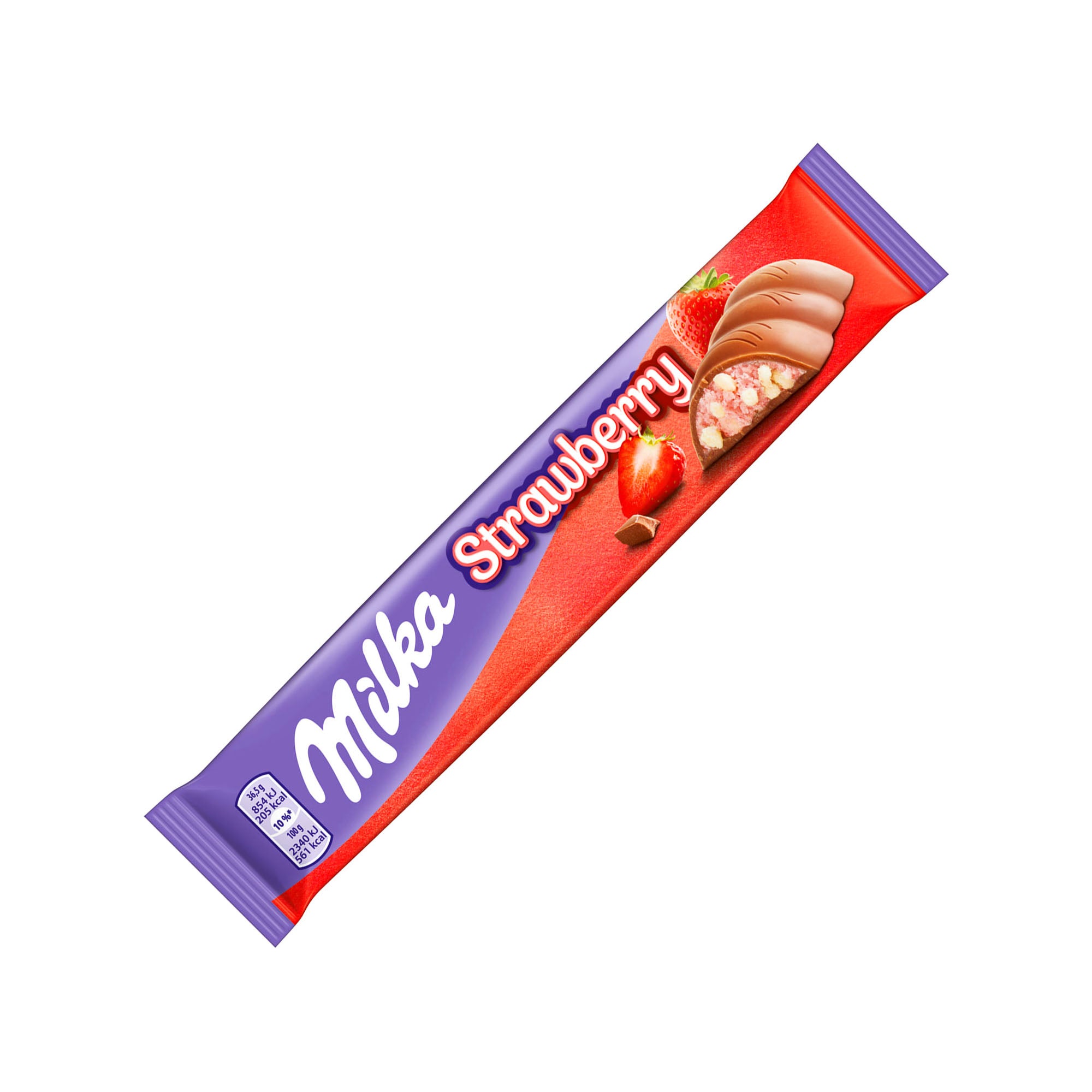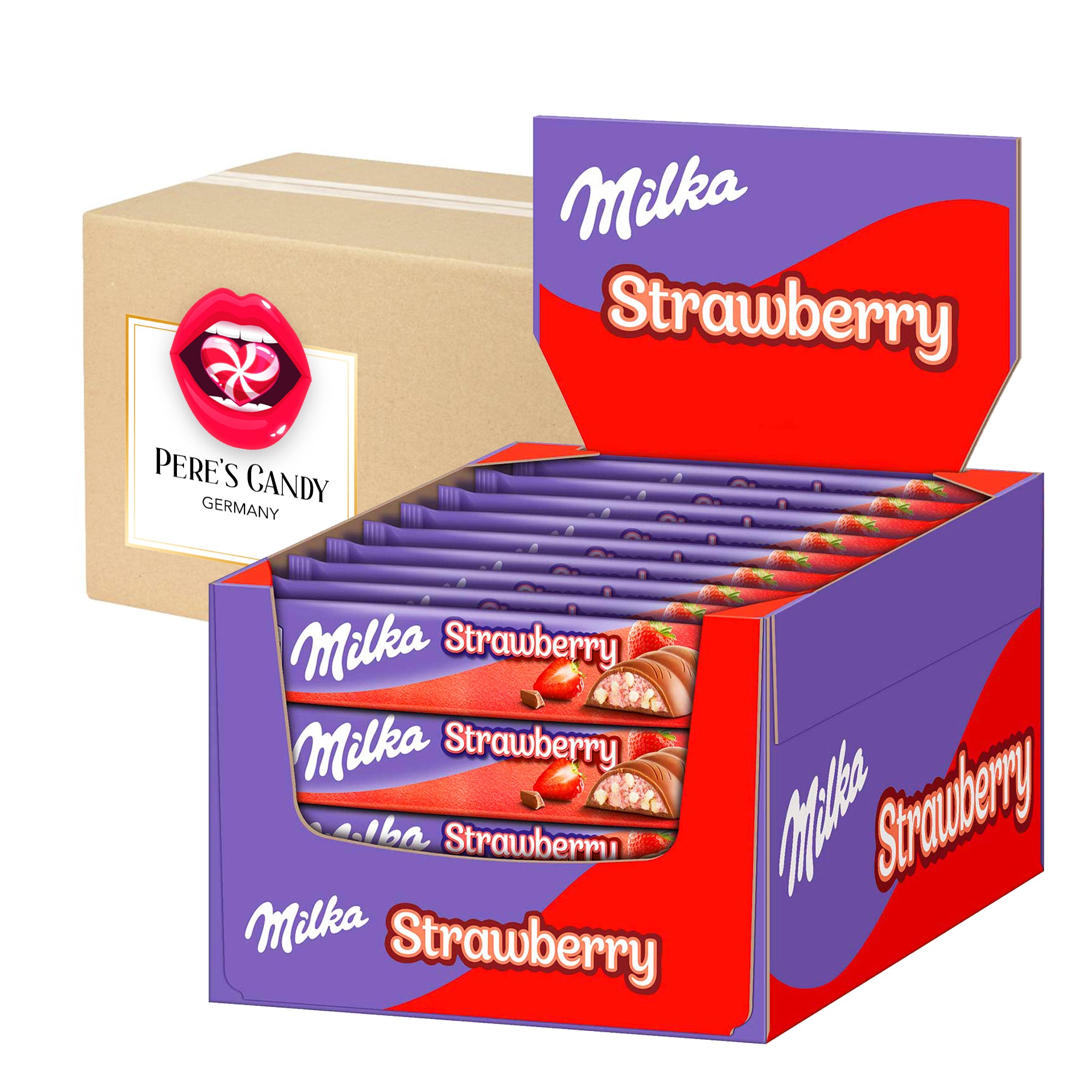 🍭 Thekendisplay mit 36 einzeln verpackten Riegeln aus Alpenmilch-Schokolade mit Milchcreme-Füllung mit Erdbeer-Geschmack und Knusperweizen.