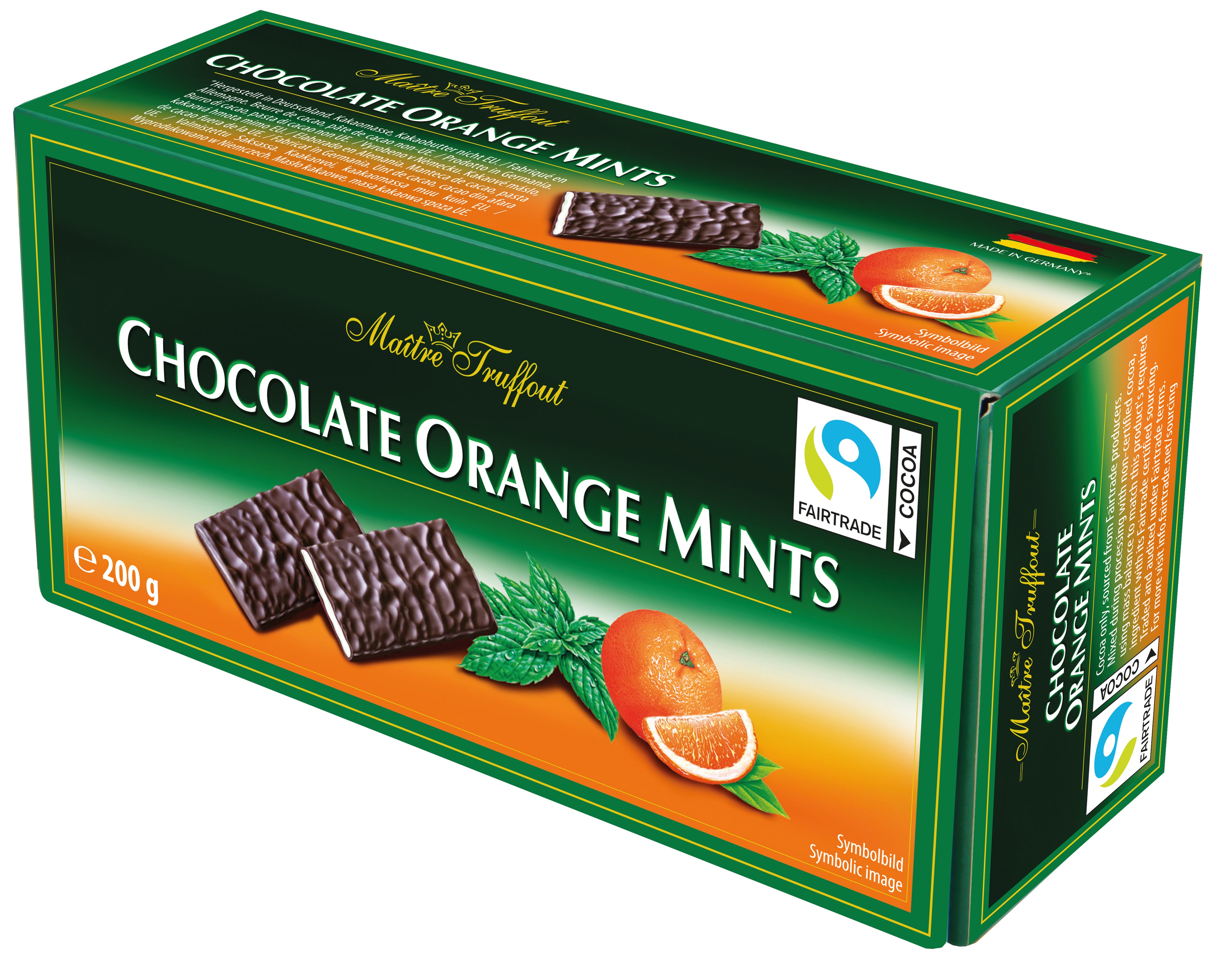 Zartbitterschokolade mit einer Fondant Füllung mit Orangen- und Pfefferminzgeschmack.