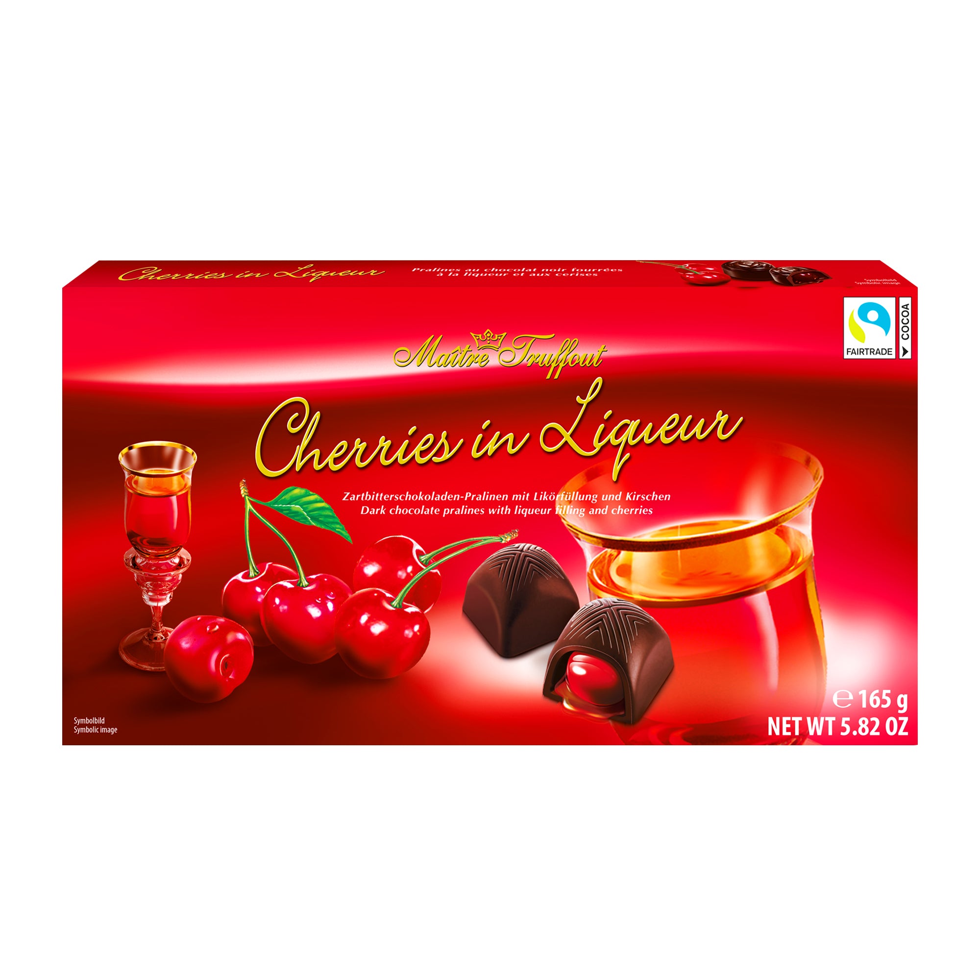 🍭Feine Zartbitterschokoladen-Pralinen von Maître Truffout mit Kirschen und Likörfüllung.