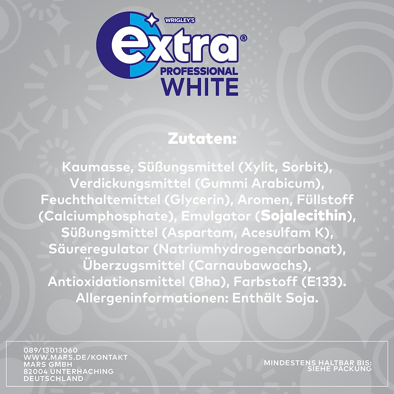 Kaumasse, Süßungsmittel Xylit, Sorbit; Verdickungsmittel Gummi Arabicum, Feuchthaltemittel Glycerin, Aromen, Füllstoff Calciumphosphate, Emulgator SOJALECITHIN, Süßungsmittel Aspartam, Acesulfam K; Säureregulator Natriumhydrogencarbonat, Überzugsmittel Carnaubawachs, Antioxidationsmittel Bha, Farbstoff E133.