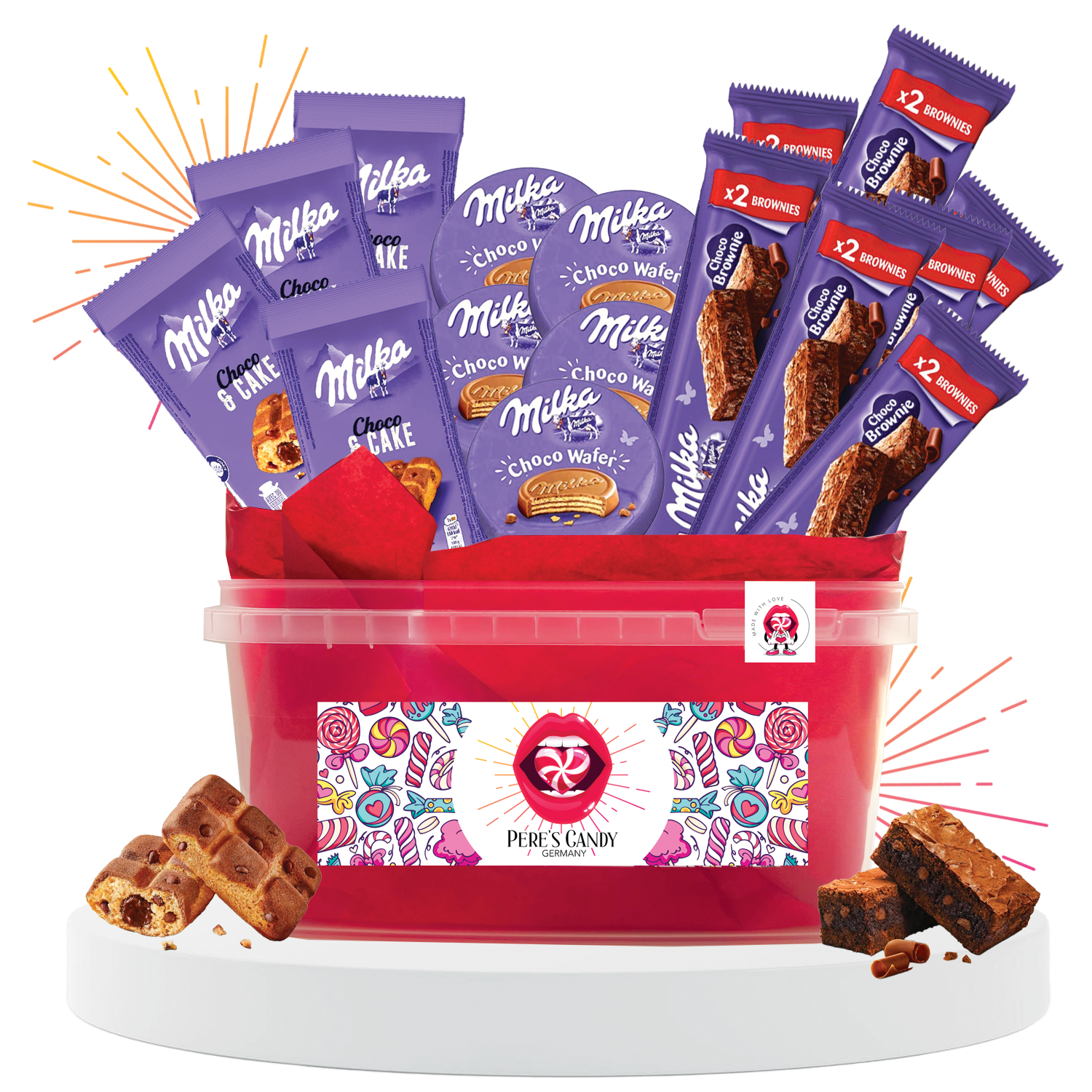 PERE’S CANDY Bucket | 30 Stück | MILKA CHOCO TRIO | 12x Choco Brownies + 10x Choco Wafer + 8x Choco Cake