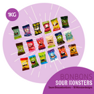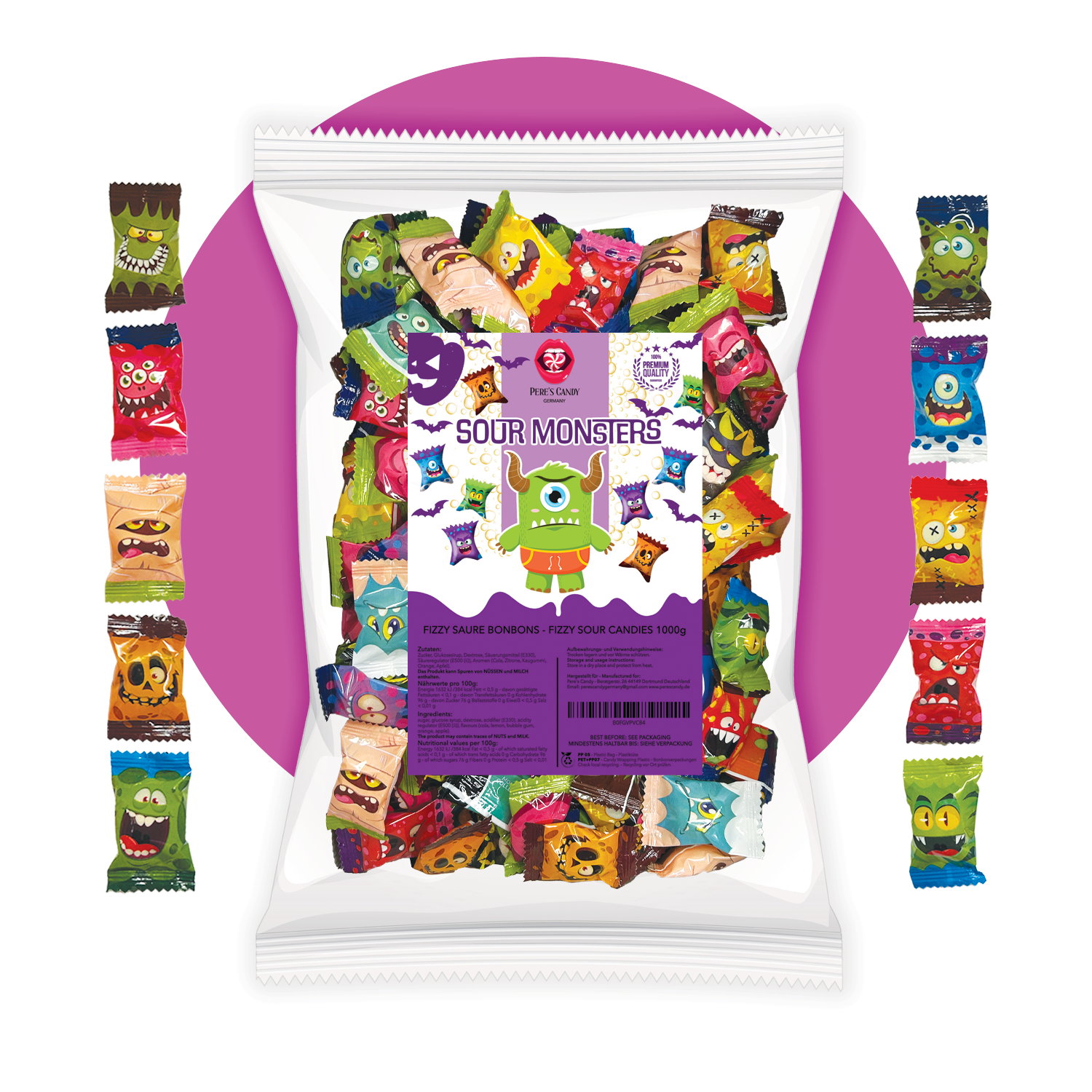 PERE’S CANDY Süßigkeit 1kg - Sour Monsters - Saure Brausebonbons – 18 Monsterdesigns – Bubble Gum, Cola, Orange, Zitrone, Apfel – Aus Italien