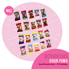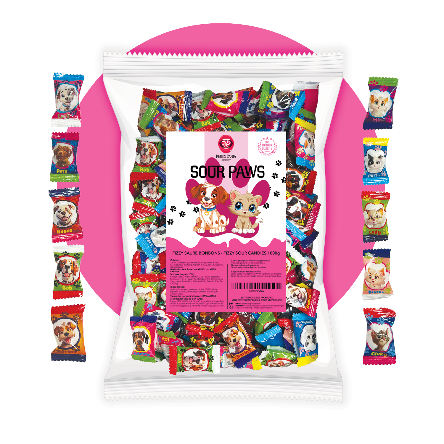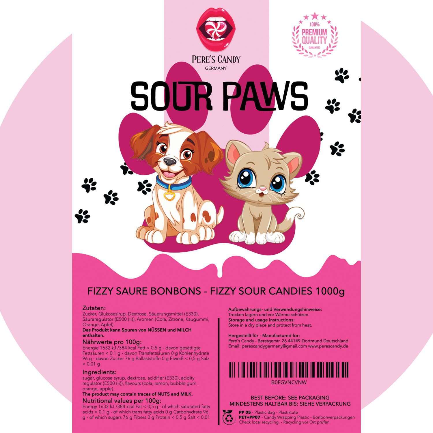PERE’S CANDY Süßigkeiten Großpackung 1kg - Sour Paws bonbons - Saure Brausebonbons – 20 Tierdesigns – Aus Italien