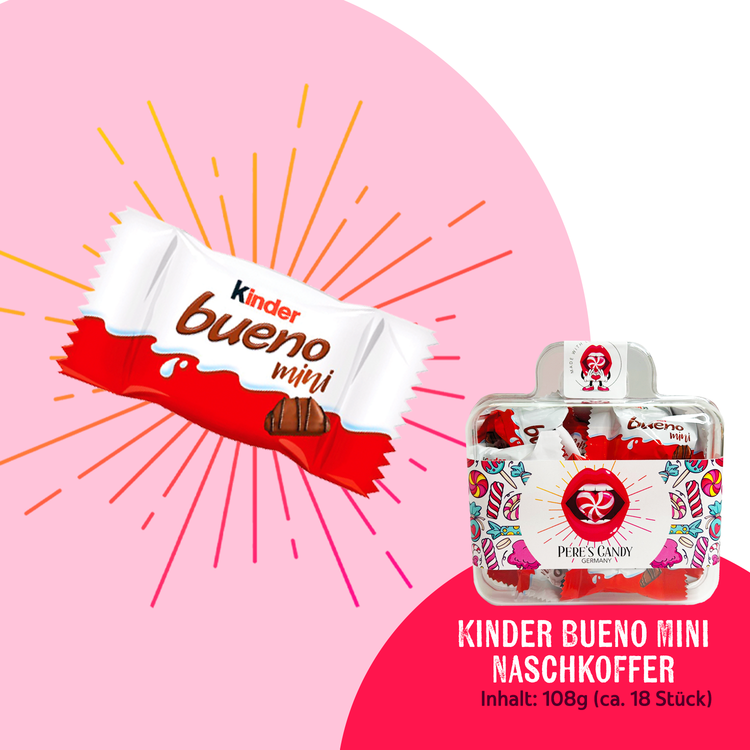 PERE’S CANDY Süßigkeiten Naschkoffer 108g | ca. 18 Stück | Kinder Mini Bueno | Geschenkbox mit Schokolade | Waffel mit Milchschokolade