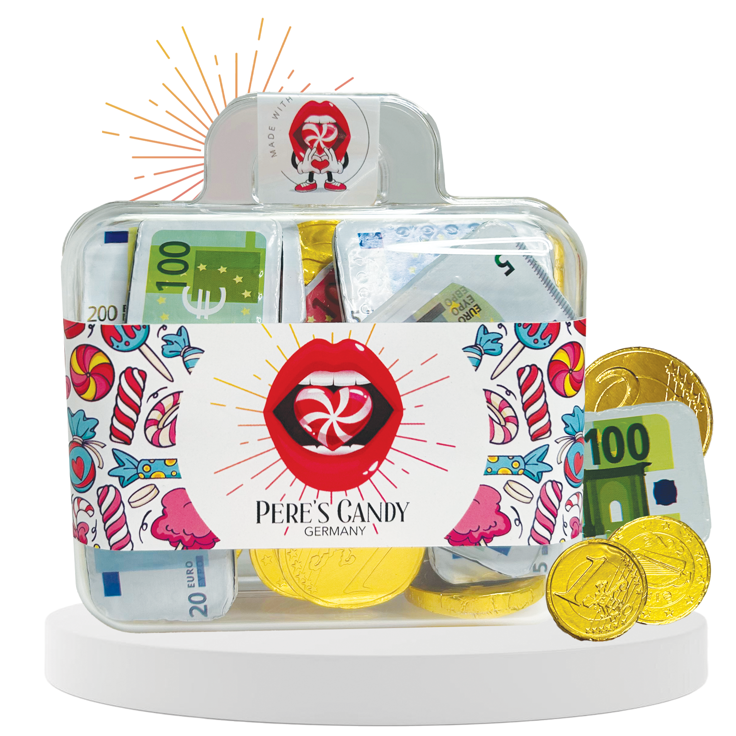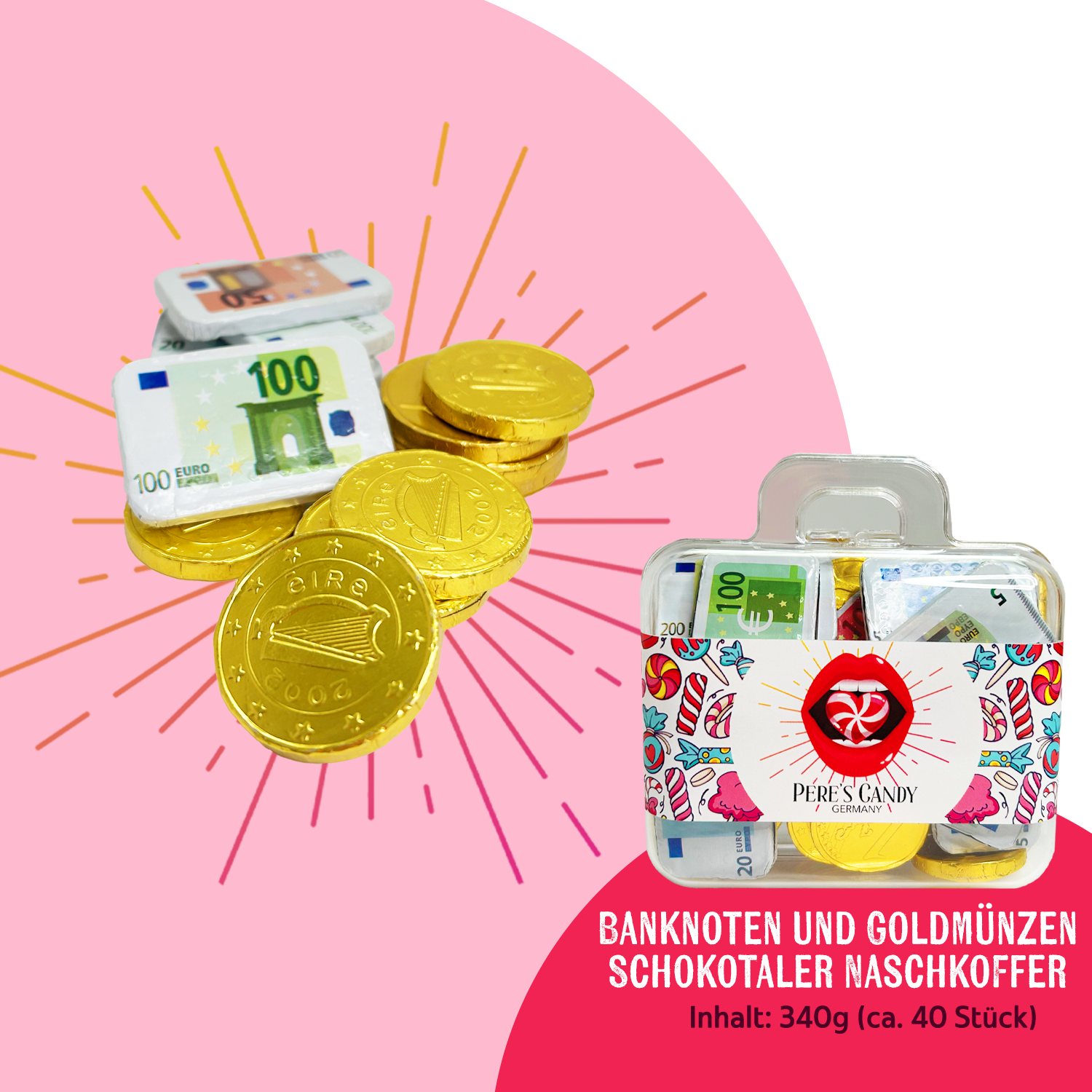 PERE’S CANDY Süßigkeiten Naschkoffer 340g | ca. 40 Stück | Banknote und Goldmünzen | Geschenkbox mit Schokolade | Schokotaler aus Milchschokolade