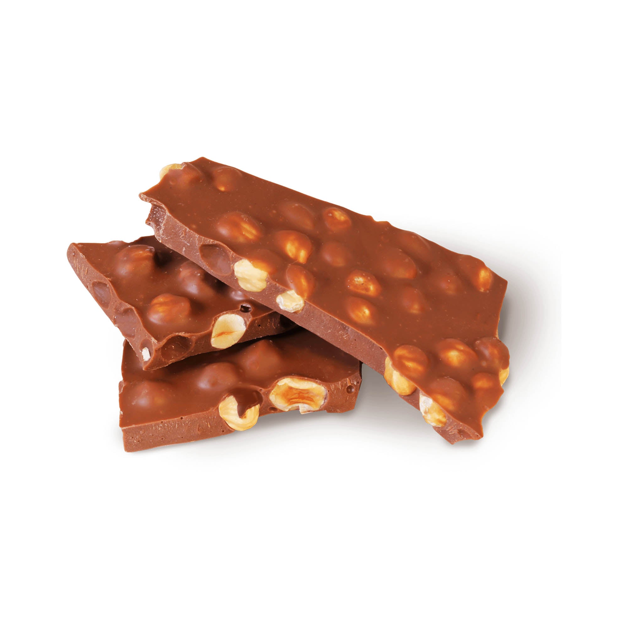 Vollmilchschokolade mit ganzen Haselnüssen.