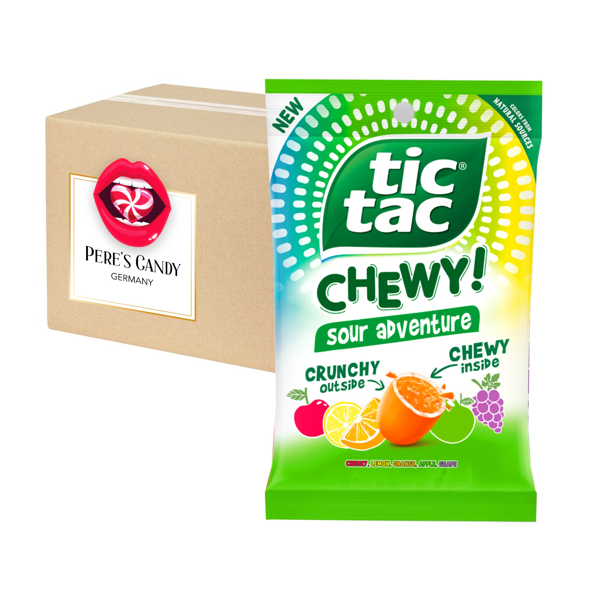 🍭Tic Tac Chewy! Sour Adventure mischt Orange, Traube, Zitrone, Apfel und Kirsche, um Ihren Gaumen mit einer pikant-sauren Mischung zu verwöhnen.