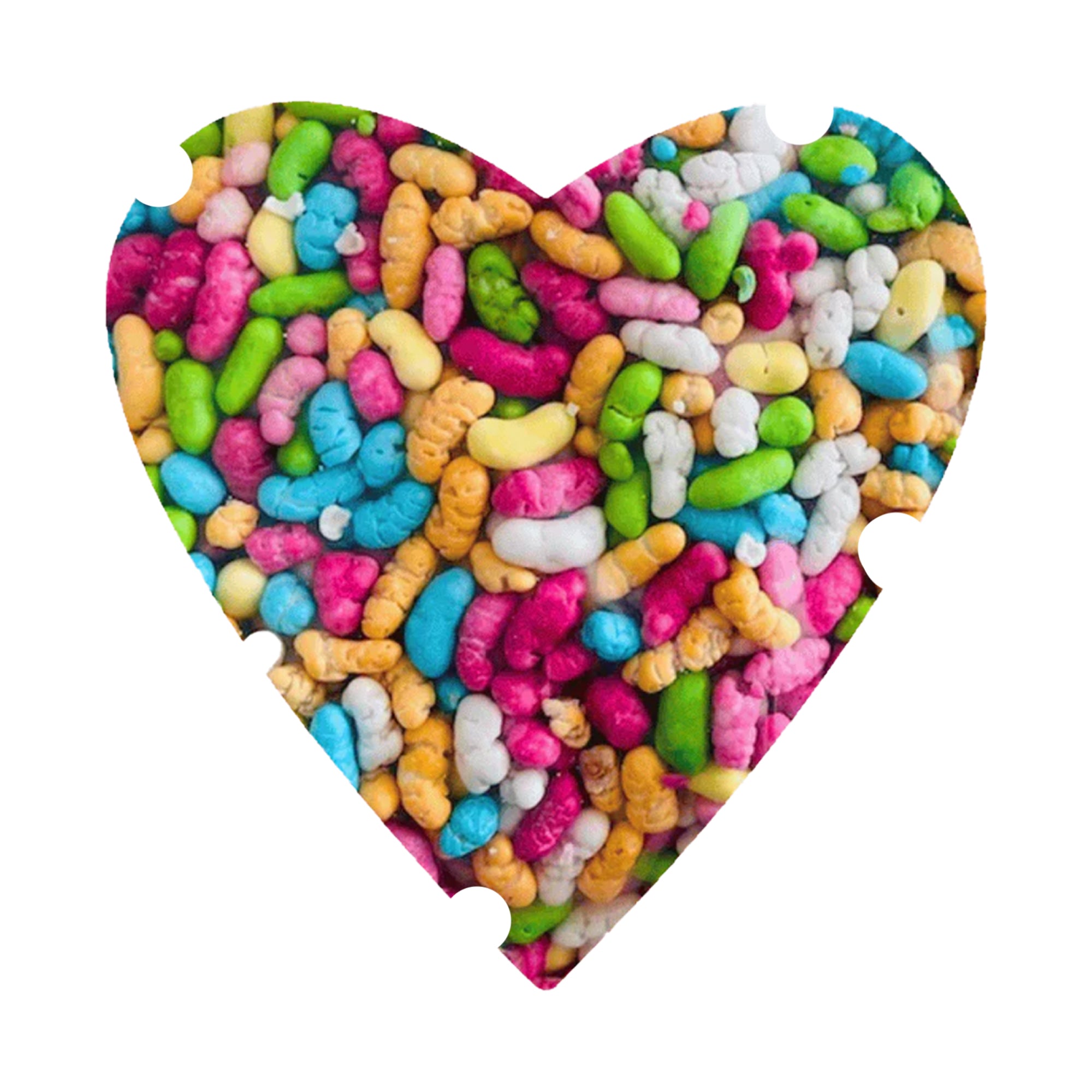 Zucker, Puffreis, Glukosesirup, Farbstoffe (E100, E133, E141, E160c, E161b, E162), Reisstärke.