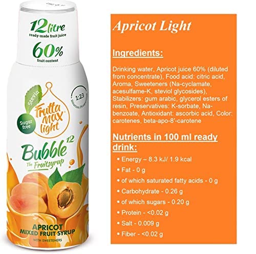 Ingredients: Drink water Apricot juice 60% (diluted from concentrate) Food acid: citric acid Sweeteners (Na-cyclamate, acesulfame-K, steviol glycosides) Stabilizers: gum arabic, glycerol esters of resin, flavor Preservatives (potassium sorbate, sodium benzoate) Antioxidant: ascorbic acid Color: carotenes, Beta-apo-8′-carotene