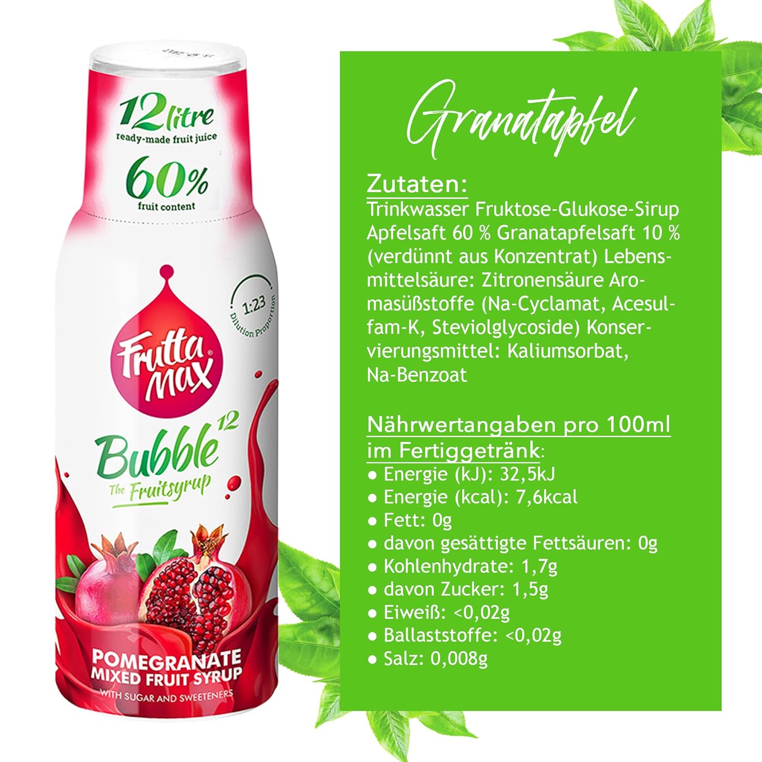 ✔ Instructions for use: Provide a bottle of still or mineral water. Fill the dosing cap up to the measuring line with Frutta Max syrup, following the markings for the respective amount of water (0.25/0.5/1/1.5L). Hold the bottle at an angle and slowly pour in the syrup. Close the bottle and shake gently and you're done!