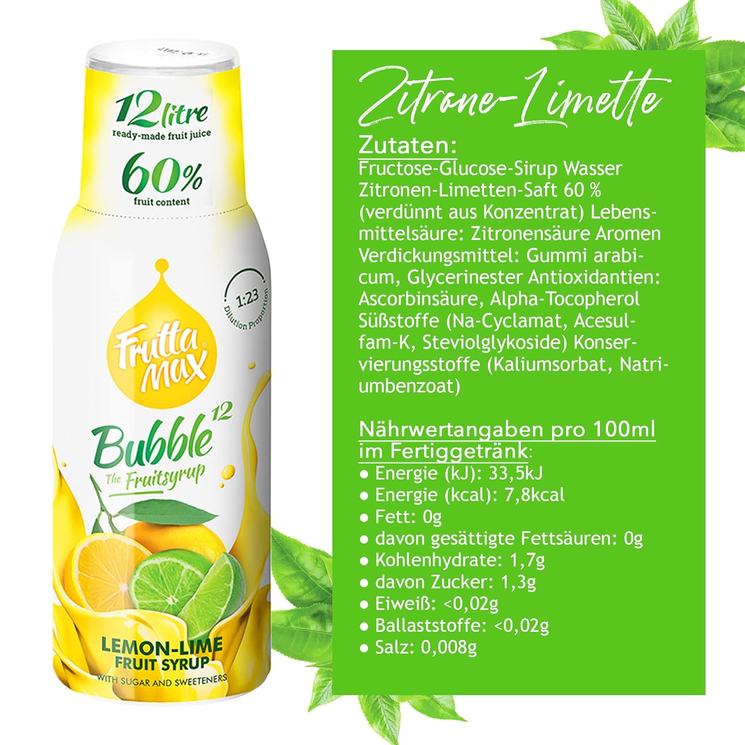 ✔ Instructions for use: Provide a bottle of still or mineral water. Fill the dosing cap up to the measuring line with Frutta Max syrup, following the markings for the respective amount of water (0.25/0.5/1/1.5L). Hold the bottle at an angle and slowly pour in the syrup. Close the bottle and shake gently and you're done!