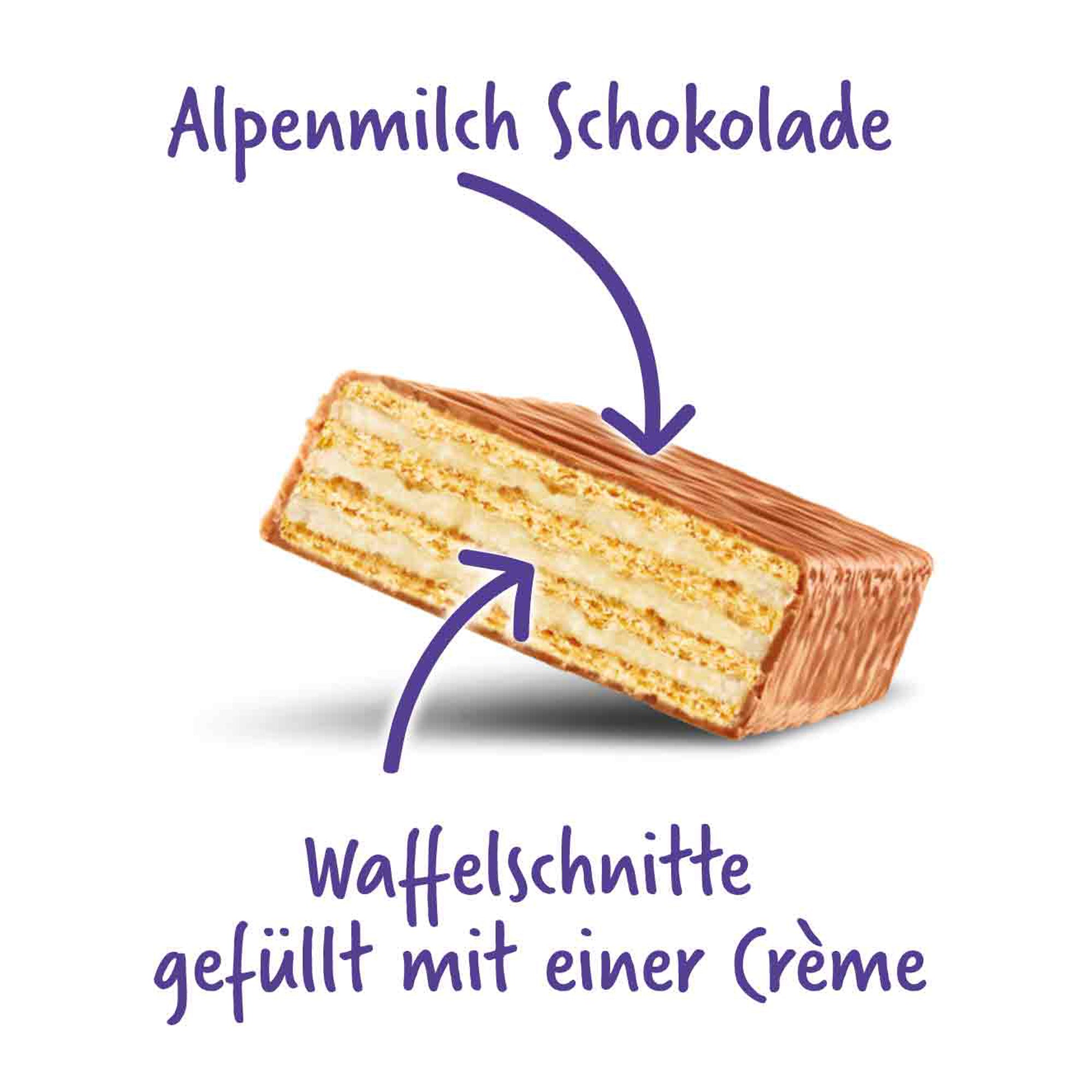 🍭 Waffle bars with cream filling covered with Alpine milk chocolate.