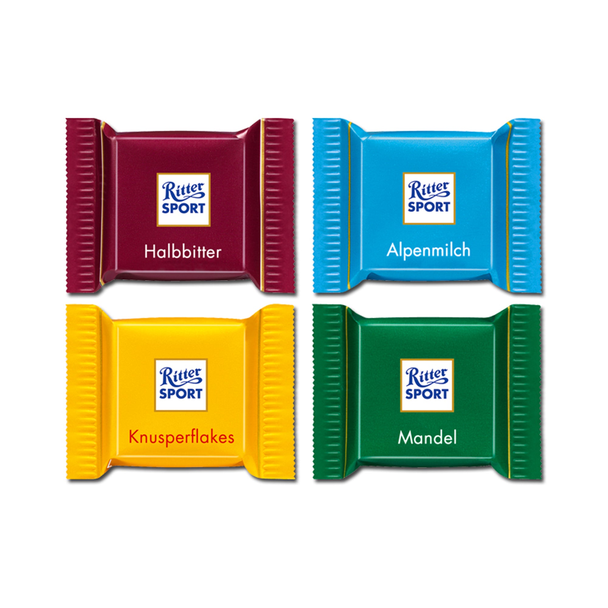Schokolademischung:Edel-Vollmilchschokolade. Vollmilchschokolade mit Cornflakes (7 %). Vollmilchschokolade mit Haselnuss-Stückchen (15 %). Gefüllte Vollmilchschokolade mit Magermilch-Joghurt-Creme (44 %). Gefüllte Vollmilchschokolade mit Nugat (42 %).