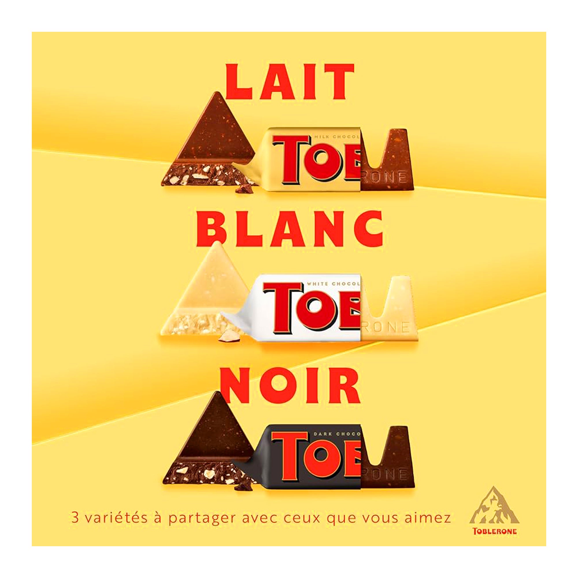 Chocolate mixture of milk chocolate, white chocolate and dark chocolate with honey and almond nougat (DE: honey and almond torrone) (10%).
