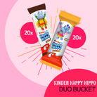 - 🍭KINDER HAPPY HIPPO DUO Bucket - 40 Stück in 2 verschiedenen Sorten - 20x Stück Kinder Happy Hippo Cacao 20,7g und 20x Stück Kinder Happy Hippo Haselnuss 20,7g.