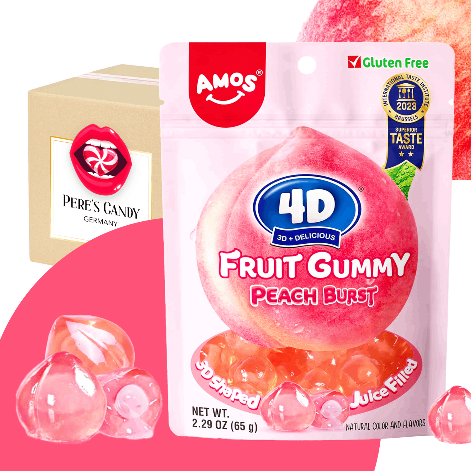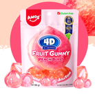 🍭 Amos 4D Juicy Burst Peach Fruit Gummy are fruity, 4D-shaped peach gummies with a juicy core and intense peach flavor. The 65g pack is ideal for snacking on the go, as a sweet in-between snack, or as a highlight on the candy bar