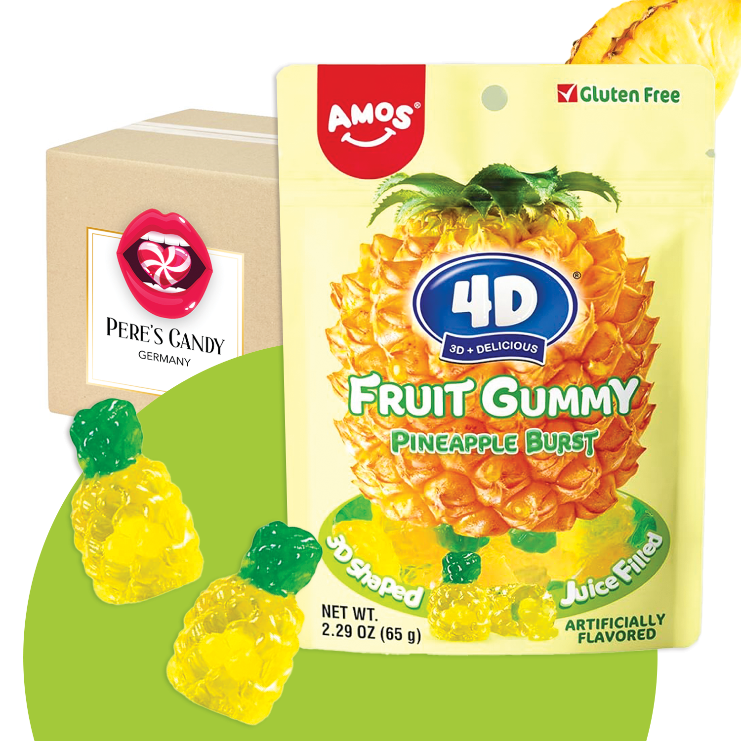 🍭 Amos 4D Pineapple Burst Fruit Gummy sind fruchtige, 4D-geformte Ananasgummis mit intensivem Ananasgeschmack. Die 65g-Packung ist ideal zum Naschen unterwegs, als süßer Snack zwischendurch oder als Highlight für die Candy Bar.